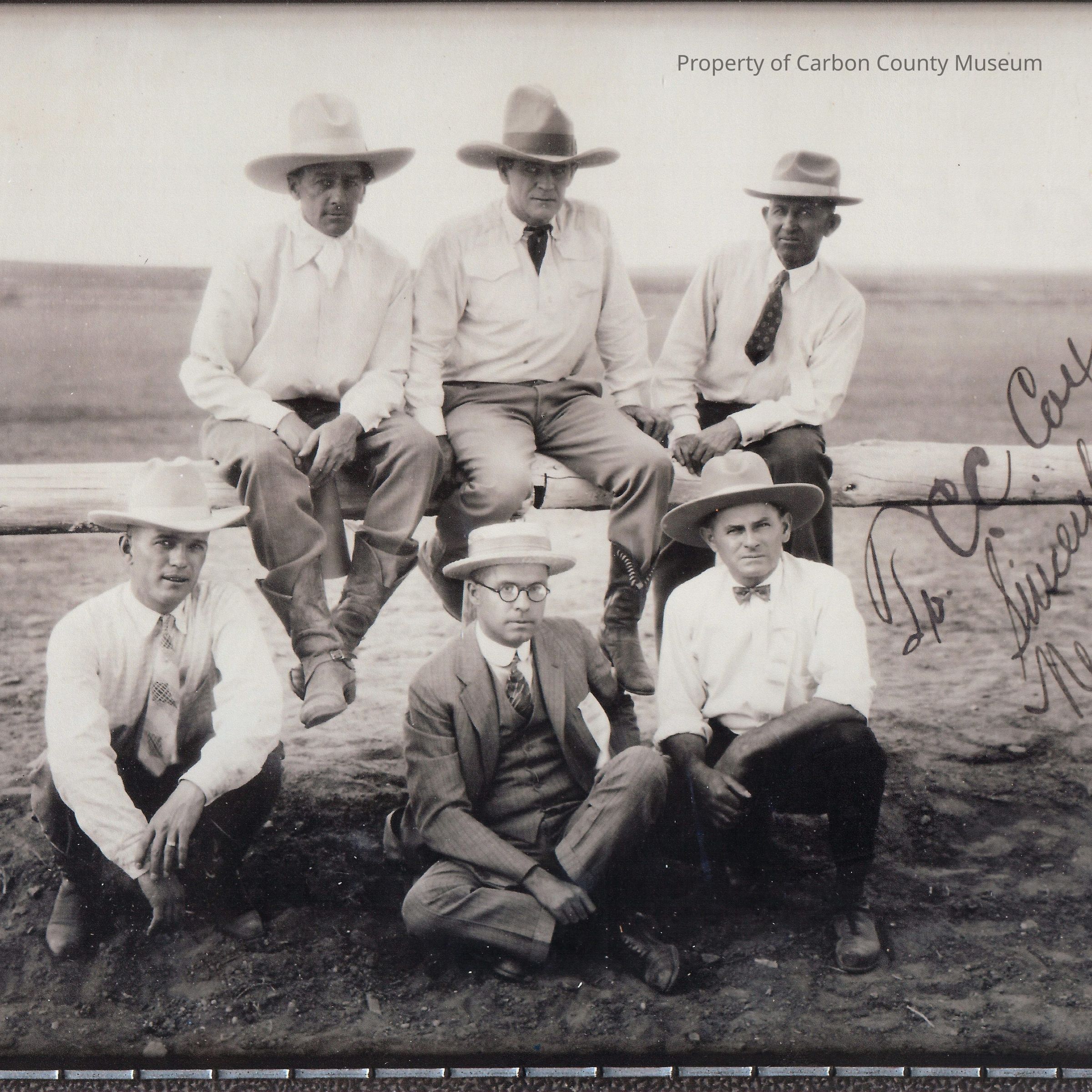 A black and white scanned photograph. Image shows a group of six men, three are sitting on a log railing and three are sitting or in squat position on the dirt in front of the men on the railing. Barren ground is in the foreground and the background. The two men sitting on the left side of the railing are dressed in cowboy garb with boots, white shirts, broad rimmed, high domed western hats, and man on far right of railing is wearing a fedora type hat, white shirt, slacks, and short neck tie. Written on the photo surface at right in black ink: To C.C. Cox, Sincerely, Neal Hart, 1926. Written on back of copy in black marker in large print: Carbon County Fair Board, 1926, Clyde C. Cox, Sec/Treas, (in suit). Donor states that Neal Hart is the man on the railing in the middle, who was a western movie actor. He came to Rawlins area to make a movie. Man in middle sitting on the ground is identified as Clyde C. Cox.Collection