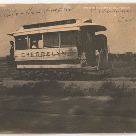 Black and white print. Snapshot. Image of a streetcar stopped on a track. Man on left platform; horse on right platform. Woman can be seen through window seated inside car. Painted on side of car: "Cherrelyn".