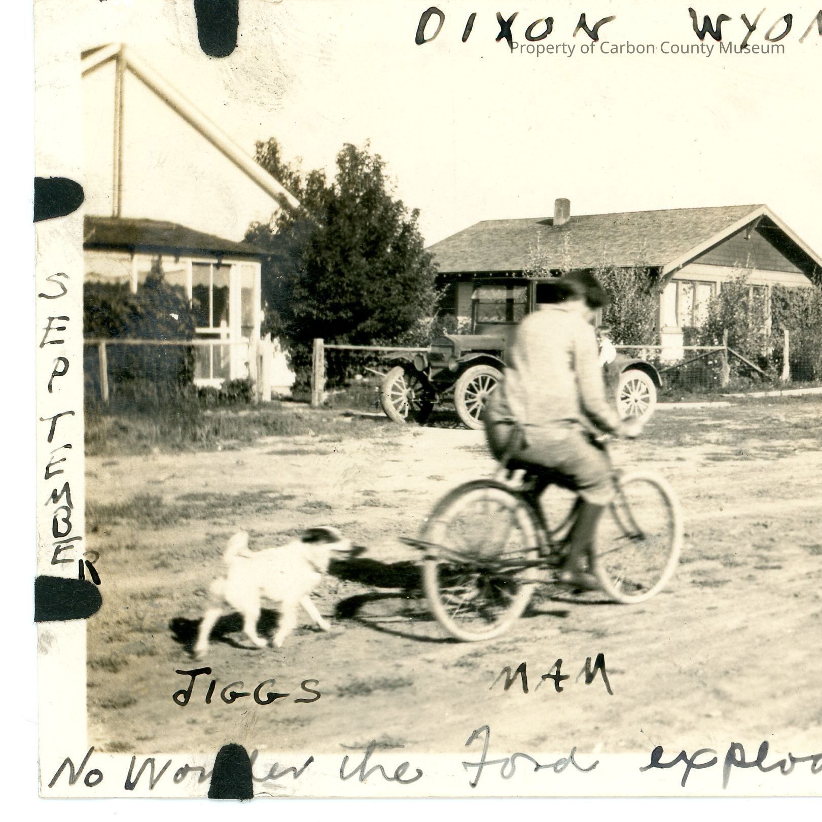 Black and white photograph. A person, labeled "MAM", is riding a bicycle down an unpaved street with houses along the left side. A small dog, "JIGGS", is walking behind the bicycle rider. Written along the top edge of the photograph is "DIXON WYOMING", along the bottom "NO WONDER THE FORD EXPLODED!", vertically along the left "SEPTEMBER", vertically along the right "1927". The number 45 is printed on the reverse.Collection
