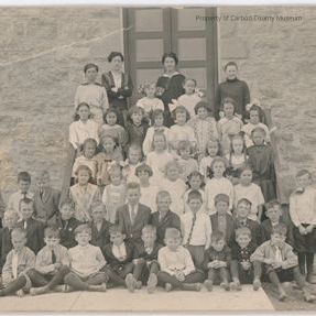 Third row: 1) Boy in striped shirt, ligth tie, and suspenders. 2) Boy in light shirt, dark tie. 3) Boy in light striped suit, white shirt, dark tie. 4) Girl in low wiasted, wide lapeled dress. 5) Girl with hair bow and overall-ish dress. 6) Girl in light dress with ear-length hair. 7) Girl in light dress with light hair. 8) Boy with old-man face in light shirt. 9) Girl in light dress. 10) Girl in light dress.