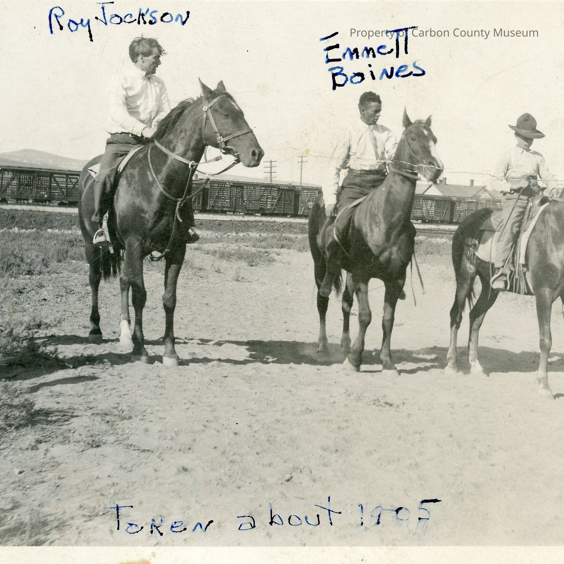 Written on emulsion surface in blue ink: "[above the head of the man at the left] "Roy Jackson". [Above the head of the man second from the left] "Emmett Baines". [At center bottom] "Taken about 1905."