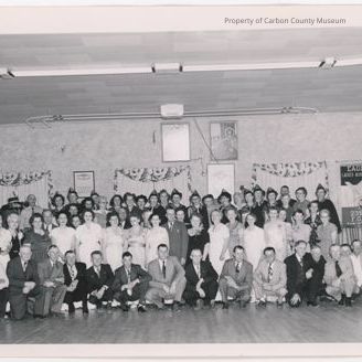7" wide x 5" tall black and white photograph with 1/4" white border. Taken in the same room as 2015.1151.5.1. Men and women, presumably from the Fraternal Order of Eagles and the Ladies' Auxiliary.