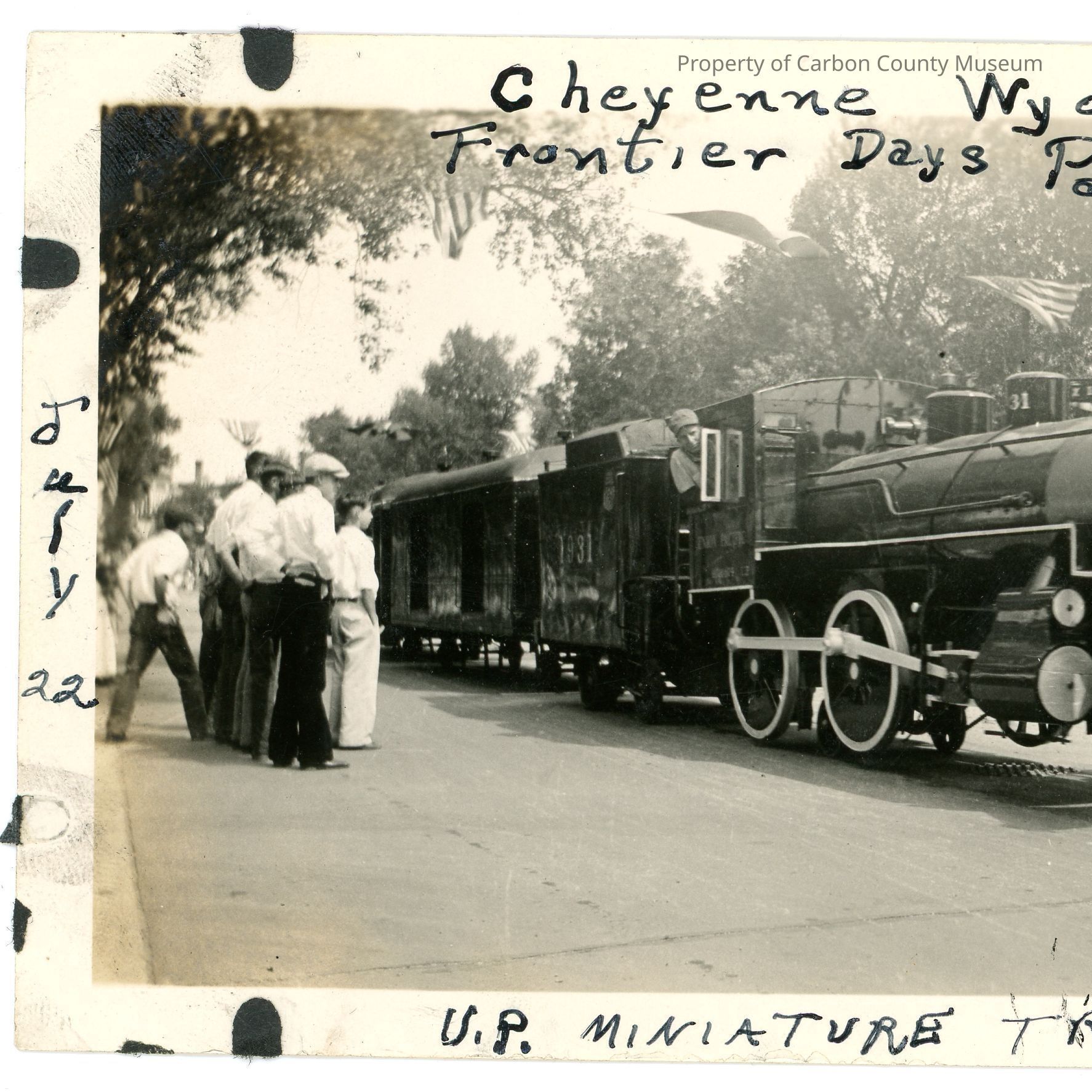Black and white photograph. A faux miniature train is being driven past a crowd. Written along the top edge of the photograph is "Cheyenne Wyo Frontier Days Parade.", along the bottom "U.P. MINIATURE TRAIN", vertically along the left "JULY 22", vertically along the right "1931". The number 2 is printed on the reverse.Collection
