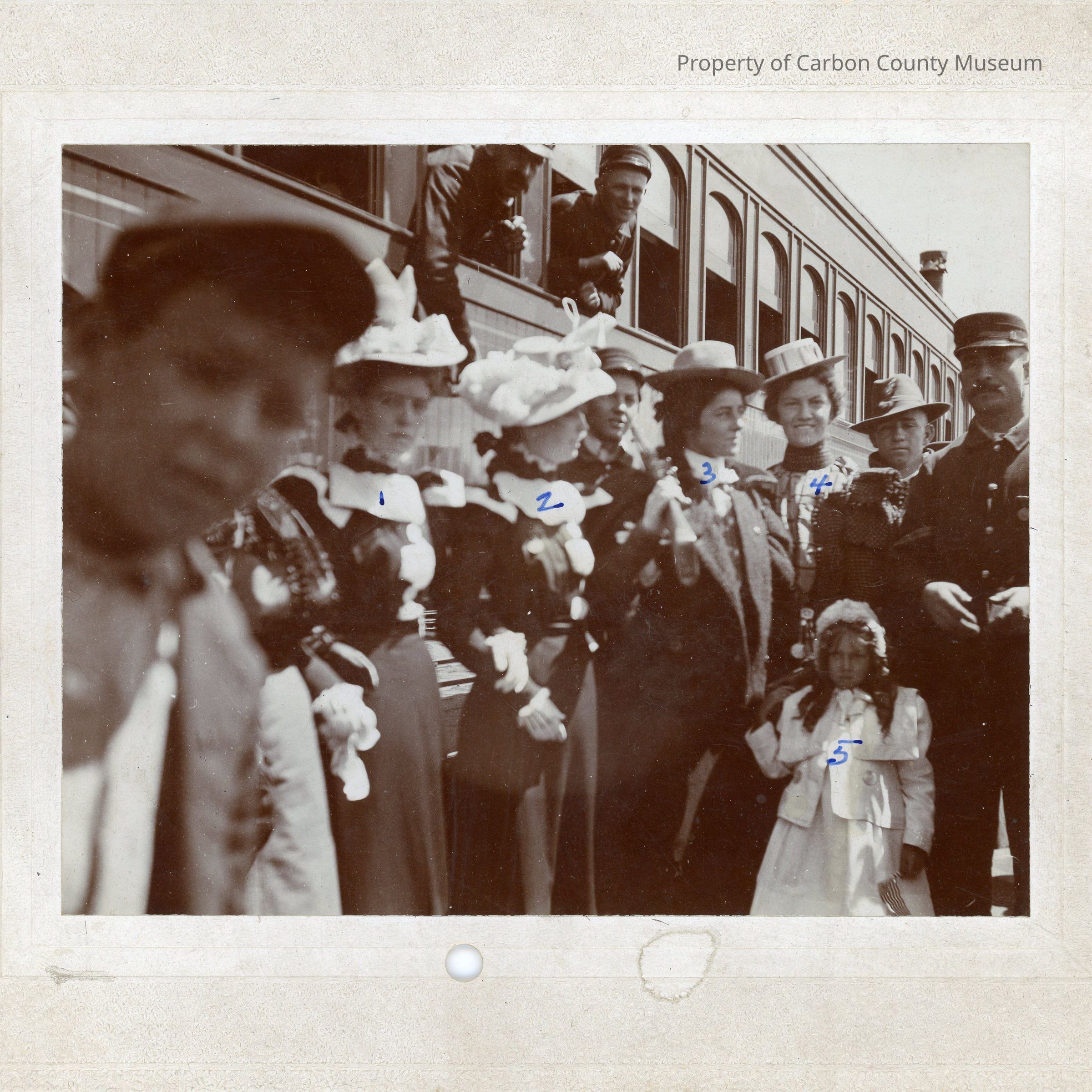 Sepia print. Snapshot. Mounted on white matboard with patterned border and single binding hole in lower margin. mage of a group of people standing on a railroad platform. Passenger train car in background. Same image as 1950.150.0375. At the center of the group are four women and a young girl. Woman to right of center is dressed like a man and is holding a rifle over her shoulder.