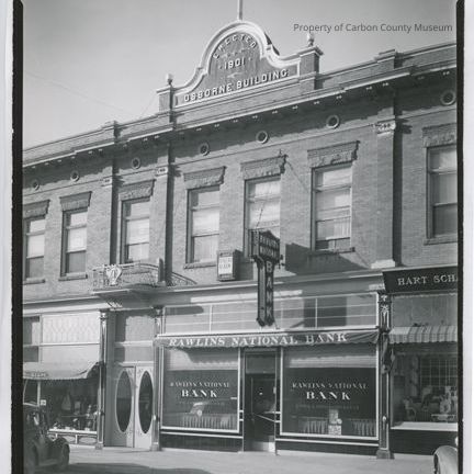 Written on center business windows: "Rawlins National Bank" "Capital & Surplus $300,000.00". A hanging sign above door says: "Rawlins National Bank". Building on right is partially seen and identified partially : "HART SCHA". Building to left has awning and all that is seen is : "STORE". A vintage car is parked diagonally on street. Building is on 100 block of 5th street.