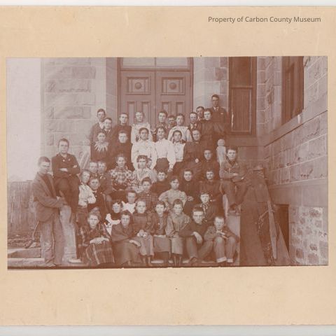 Update - January 2010: (Please note this image is same as 1948.037.0038.) Sepia print. Snapshot. Mounted on tan matboard. School class photo with students posed on the steps of a large stone building. Group of 42 students.