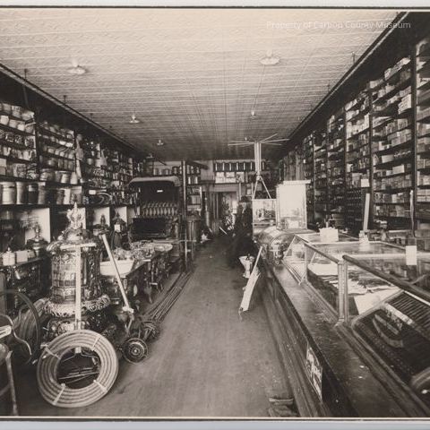 Interior of Bennett Hardware, Mr. Ed Bennett by counter taken about 1900. SHows stoves, buggy, lawn mower