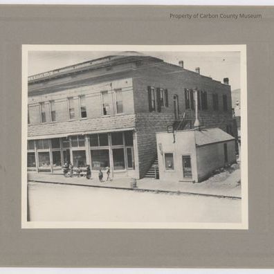 Update - 2009: Black & white print. Snapshot. Mounted on grey matboard with raised center, patterned inner "frame" and raised outer "frame" with beveled edges & parallel line decoration. Image of a two-story & brick building with smaller clapboard building at right. Stairs to second floor of large building between the structures. Lower floor is faced on front with floor to near ceiling windows & recessed glass doors. Sign on building cornice: "J. W. Hugus and Co." Small group of people on plank sidewalk in front of building - most are Native Americans. Dirt street in foreground. Picture taken from elevation. 400 block Cedar Street, Rawlins, WY.