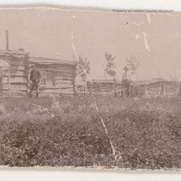 Update 1/2008: Black and white print. Mounted on matboard. Image of rough wood slat cabin and several other log buildings with an overgrown field in foreground. Several small trees near buildings on right half of photo. Three people-one woman and two men-spaced through image in front of buildings; cows can be seen at right. Pile of rocks and low hill can be seen in background at left.