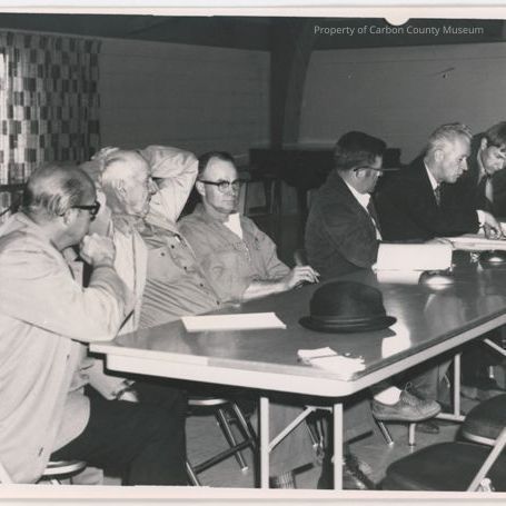 Black & white print. Snapshot. Image of six men at a table inside a large room with plaid curtains. Three men at far end appear to be looking at plans; each is dressed in a dark suit. Three men at near side are watching & are more casually dressed.