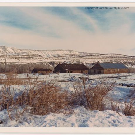 Color print. Snapshot. Image of three large wood-frame buildings with thick snow on the ground. Shrubs in foreground. Snowy hills in background. Buildings appear to be in disrepair.