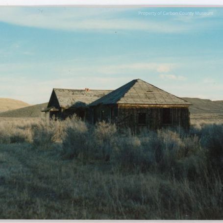 1. Image of two frame buildings sitting side by side on the sagebrush prairie. Hills in background. Front building has a pyramid-shaped roof. Back building has a small covered porch.