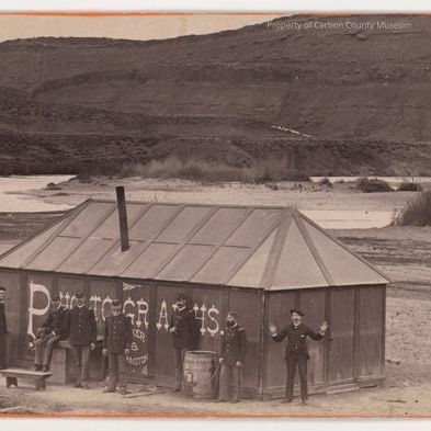 Pink mat back. Written on the back in pencil:"The portable photography outfit of Baker & Johnston some place out of Lander [rest of paragraph interspersed with short hand that needs translation].