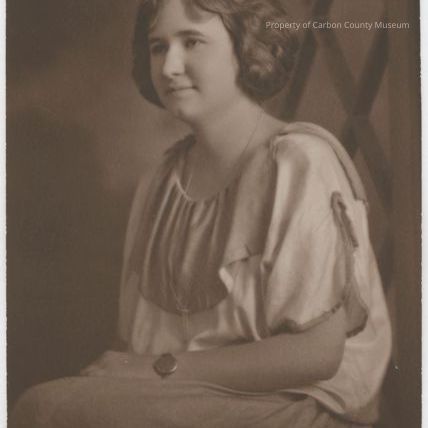 Sepia print. Studio pose. 3/4 portrait of a young woman seated in front of backdrop with diamond design. She is wearing a two colored blouse & skirt, wrist watch & a long necklace chain. Her hair is short & full.