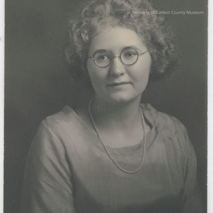 Black & white print. Studio pose. Half length portrait of a woman wearing a medium-colored dress/blouse with a string of pearls around her neck. Her hair is short & curly & she is wearing round lens glasses.