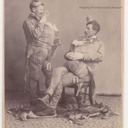 Update 1/2008: Black and white print. Cabinet card. Tan matboard. Studio portrait. Image of two men dressed in identical clown outfits. One is sitting and one is standing. Plain backdrop and patterned rug with fur rug under chair. Both men are wearing light colored plaid suits stuffed with padding and fastened with large round buttons down the front. White shirts with large silk bow ties, boots and tiny plaid top hats. Each has a horseshoe watch fob. Seated man is wearing white gloves; standing man is holding a bubble loop (?) in on hand and a cigarette in the other.