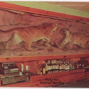 4" tall x 6" wide photograph of behind the bar at the Rustic Bar in Saratoga, Wyoming. The wall is mostly covered by a large display case, displaying two mounted mountain lions, facing each other with tails out behind them, fangs bared, in a faux mountain setting, possibly with the remains of a smaller animal between them. The small amount of wall visible above the case is a light green, and the ceiling is white. To the right of the case rows of beer bottles can just be seen.