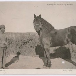 Sepia print. Snapshot. Printed on postcard paper. Unused. Image of a man holding the reins of a dark colored (stallion). Posed in front of brush with hills in the background. Man is dressed in work clothes & hat.