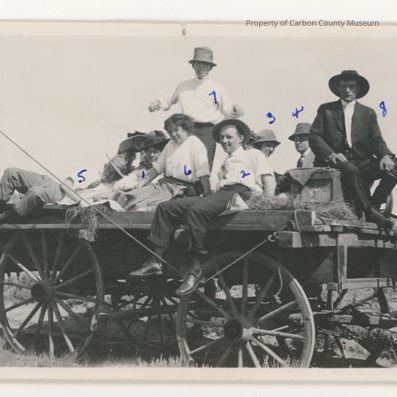 Update 2009: Black and white print of group of people on a wagon. From left to right: man semi reclined wearing medium dark slacks, white shirt, tie, and hat; lady only partially visible has a large hat; lady with striped dress and large dark hat; lady in white blouse and medium dark skirt; person standing behind with white shirt and narrow brim tall crowned hat; man seated with legs dangling off side, wearing dark slacks, white shirt and hat;. Man dressed in jacket, tie and hat, only head and shoulders visible. Man sitting on box holding reins in his left hand, he is wearing a dark three piece suit with white shirt and tie and has on a dark, large brimmed hat. Wagon is a flat bed with a small amount of loose straw on top. It has a pole attached to back of wagon with rope extending to front corner of wagon. There is a box hole under where driver is sitting. Buck wagon wheels are larger than front wheels. Hind quarters of a horse visible to photo right.