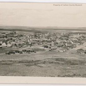 1.Bird's eye view of early Rawlins. Foreground possible pasture with 4 fenceposts. Behind the open area is a dirt road with telephone poles along edge of road. Streets appear to be unpaved. Old Pen is on photo left, St. Joseph School and Catholic Church is in background right. Central School and the old courthouse is to the left of the church. 4.5" x 2.75."
