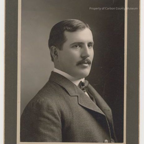 Update - 2009: Black & white print. Studio portrait. Mounted on dark green-grey matboard. Head & shoulders portrait of a man in a dark suit, white shirt & dark bow tie. He is posed nearly profile facing toward viewer's right & looks back to camera. He wears a mustache & his short hair is parted on the left. Painted backdrop behind.
