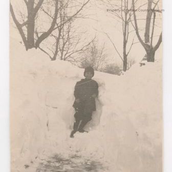 -3 5/8" X 5 1/16" black and white photo of a child standing in a shoveled out area, amid snow that comes to his head. Written on the bottom, at his feet, it says "Marshall 4/2" - snow on walk at house". Small pencil scribbles on back. - placed in 2015.1161.7.1 photo folder