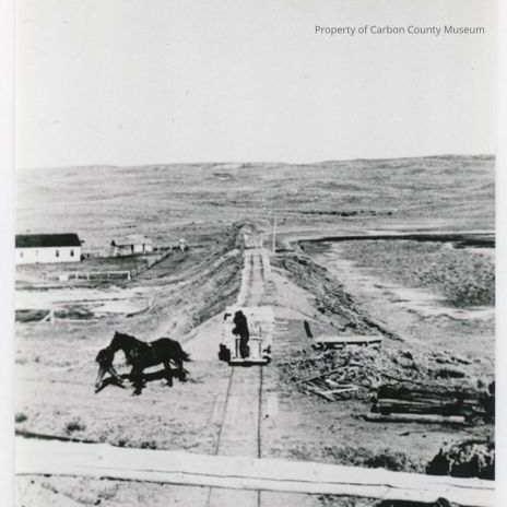 Two black & white copy prints. Snapshot. Image of a railroad track running through center on a raised beam. Taken from a bridge or wood-filled car on the track. Car with wood ties on track at center - person heavily bundled up, on back of car. Horse & man standing at left of track at center; junk pile at right. Ranch buildings in background at left; hills in far background.
