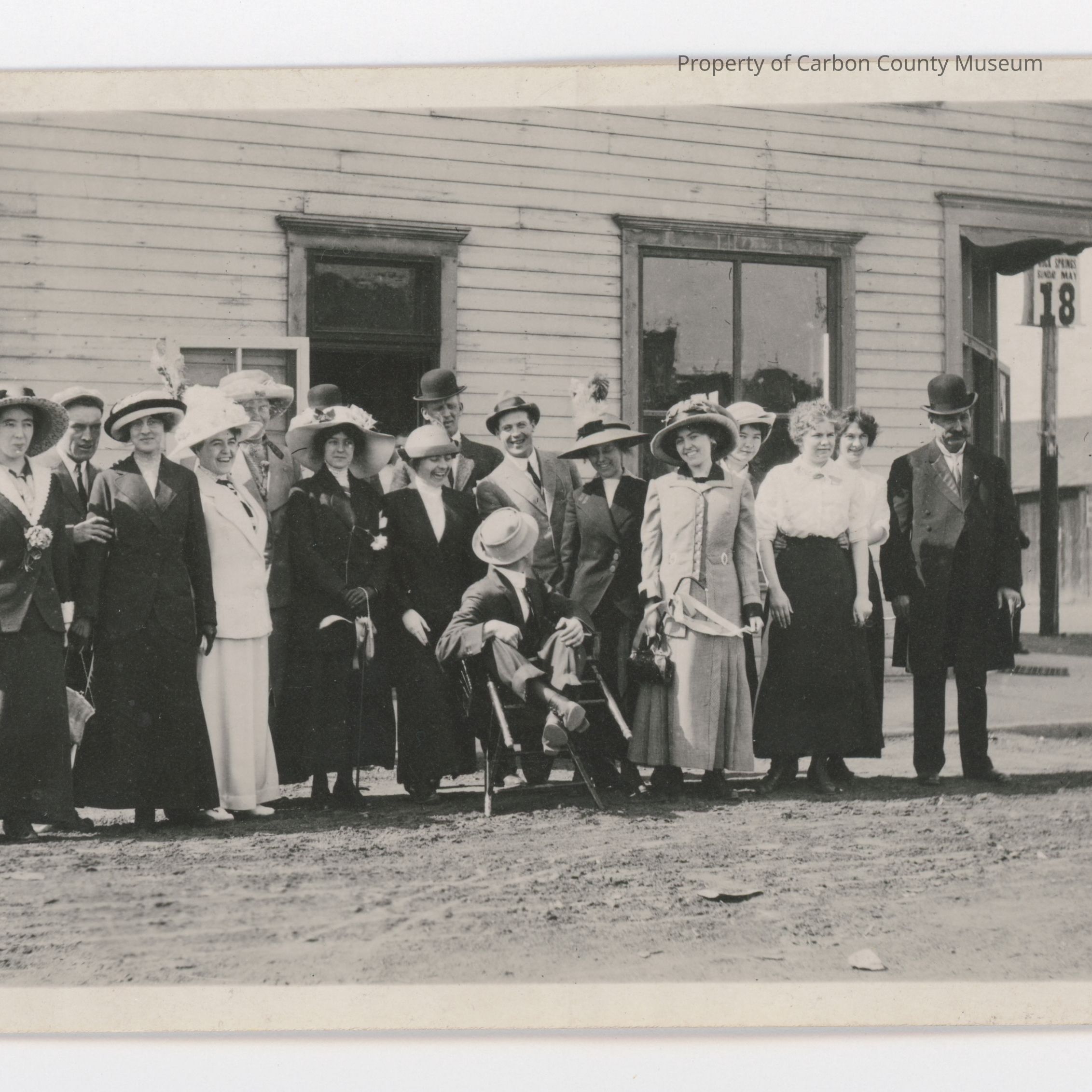 From left to right: A woman in a wide hat and a dark dress with white cuffs and collar; a man with his arm on the woman to his left; a woman in a dark dress holding an umbrella, with a large hat with a black brim; a very smiley woman in a white dress and hat; a tall woman in a light dress and hat, hard to see behind other women; a lady in a dark dress and extra large hat; a woman in a dark dress with a white shirt and small hat; in back, a very tall man in a dark suit and hat; in the front the seated man in a dark suit and light hat; a man in a light suit and hat; woman in a dark dress with a wide hat with feathers; woman in a light dress and big hat; woman with a light hat; woman in a white shirt and dark skirt with light hair; woman in a light shirt and dark skirt and dark hair; man in a dark suit and hat.
