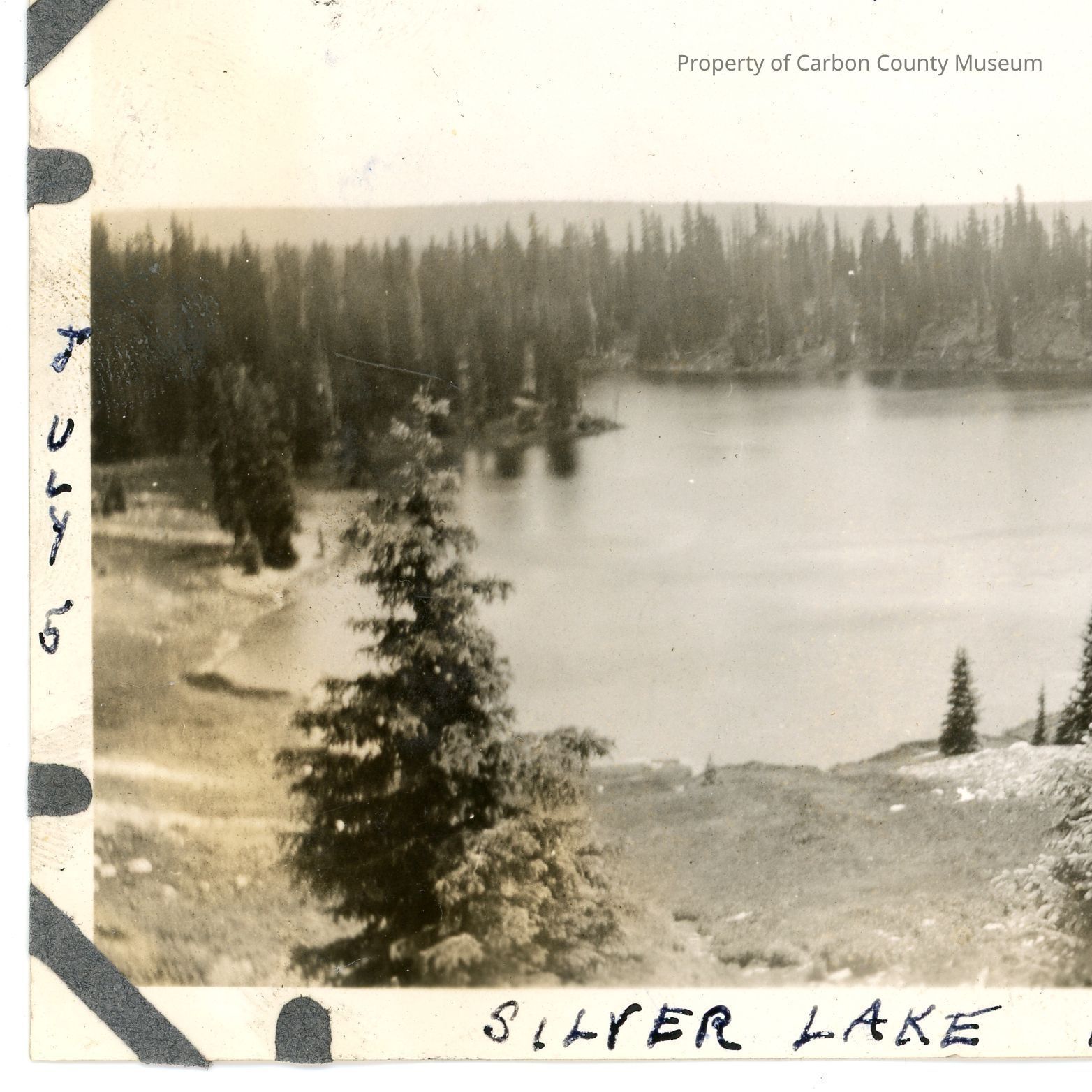 Black and white photograph. A lake surrounded by a forest. Written along the top edge of the photograph is "SNOWY RANGE", along the bottom is "SILVER LAKE FROM OUR CAMP", vertically along the left "JULY 5", vertically along the right, "1934". The number 164 is printed on the reverse.Collection