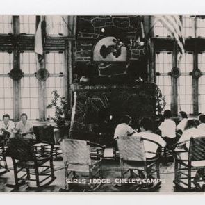 5 7/16" x 3 5/16" black and white unused postcard. Image shows the inside of a lodge with a wall that's mainly windows, with a large fireplace in the center. Chairs are in rows, facing away from the camera, 7 with white-shirted girls, also facing away, in them. Two women in light colored dresses, sit to the left facing the camera. "Girls Lodge, Cheley, Camps" is writen in white on the bottom center.Collection