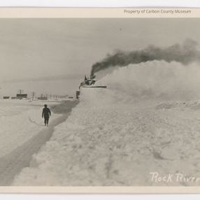 5 7/16" x 3 5/16" black and white unused postcard. Image shows a person walking down a plowed road of snow, with a huge (3 times the height of the walker?) steaming plow approaching the camera, throwing snow and steam to the right. Written in white in the bottom right corner is "Rock River 64"Collection