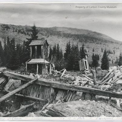 Black & white glossy print. Image shows a tall, narrow two story wooden structure with a smaller narrow wooden structure on the right. Both of these units have fallen into extreme disrepair & are tilted & off foundations. Other lumber & timbers are seen in foreground as though other buildings have been demolished. A barren hillside is at background. An evergreen tree line is at center.