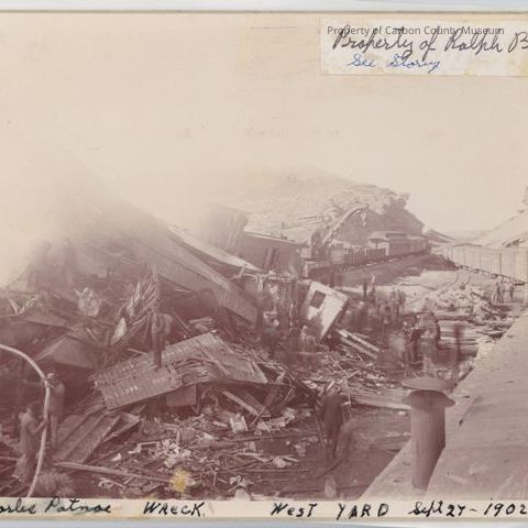 Written on back in black: "Copied by State Mounted" In pencil: "Charles Patnoe wreck in the west Rawlins yards on Sept 27, 1902. a special fruit train got out of control of the engineer when the air brakes failed & collided with a switch engine & cars it was moving. Killed were engineer Charles Patnoe, the fireman, James Welch, Paul Dayton, & unidentified man. Three cars of sheep, three cars of potatoes, one car of ore, the caboose & several cars of fruit were burned." On white adhesive tag: "Train wreck".