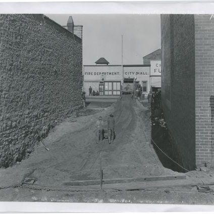 Black & white print. Image shows two workman pushing a roller on a dirt area between two buildings. At the top of this road area is a dumping? equipment unit. Several men are near this unit. North of the alley Building at left is of irregular stone and building on right is of brick. In the distance are two white framed buildings. Building on left has dark lettering across the front top portion that reads: Fire Department. Building on right has similar sign that reads: City Hall. Note: 200 block 5th street.