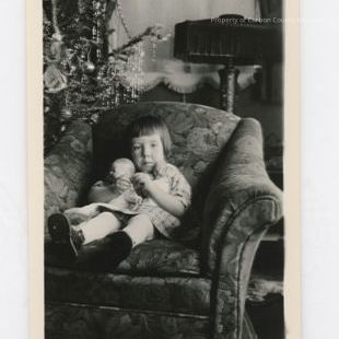 2 11/16" x 4 9/16" black and white photograph. A small girl with short hair and a plaid dress sits in an armchair, her legs straight out before her, holding a doll. The armchair has floral patterned fabric. In the upper left corner, a tinsel-covered tree is behind the girl. On the right is a dark lamp.Collection