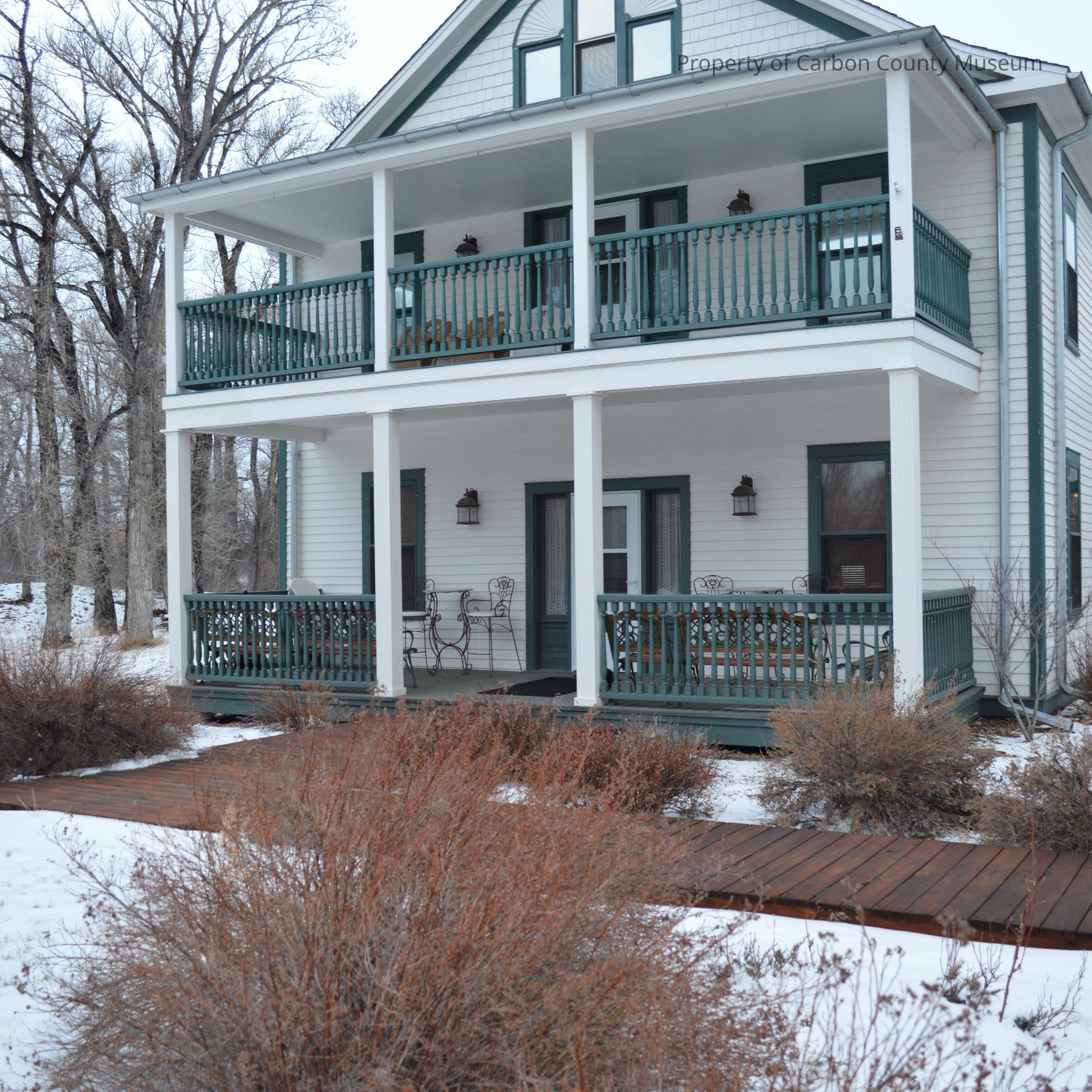 Update - 2009: Three black & white prints of supply wagons on rutted dirt street. Taken on 800 block of W. Spruce. Teams of eight horses pulling loaded wagons. Painted on roof building on photo left: "C R Bell's sorrells". Bell residence beside barn.