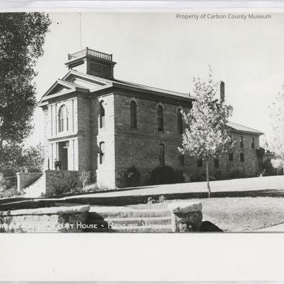 On front written in white print on lower left front edge from negative process: Carbon County courthouse Rawlins, Wyoming.