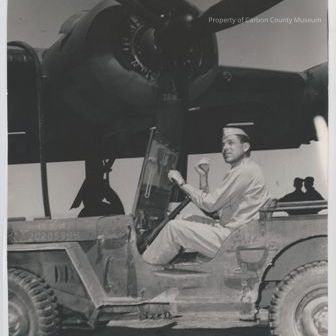 7 15/16" x 9 15/16" black and white photograph. A close-up shot of a man in a military uniform in a jeep, close enough that both the front and back of the jeep are cut off. Behind the jeep is a wing, wheel mechanism, engine, and propeller of a dark colored airplane. "U.S.A. 20205985" is painted on the jeep. The shadowy outline of two men can be seen over the back of the jeep.