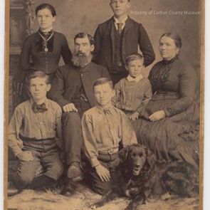 4 3/16" x 6 3/8" sepia family photograph. Kneeling in the front row are two boys in striped shirts, the older with a bow tie, and a black dog. Seated behind them are a man in a dark suit with a large beard and a woman in a dark dress, with a standing young boy in a light shirt with a white collar between them. Standing behind the father, one on each side, are a girl in a dark dress with a high collar and a somewhat chunky necklace, and a boy in a dark suit. There is a studio backdrop behind them, and a fur carpet beneath them. They all have serious faces, except for the dog who looks quite excited. "J.L. Richmond Campbellford, Ont" is printed on the bottom.