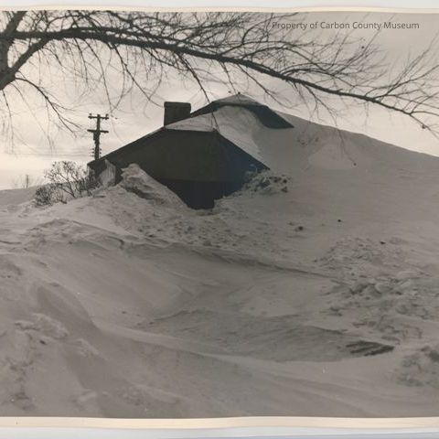 Update 2008: A black and white print, 8" x 10," of a house in Sinclair, Wy during the blizzard of 1949. The house is partially covered by a massive snowdrift. All that shows is a front portion of upper one third of house front and the left side of roof line. the apex of the eaves is visible only at top portion. Secondary porch? roof is covered by drift with left side visible. A tree branch is at top foreground on upper left edge of photo. An electrical pole with wires is in the background left.