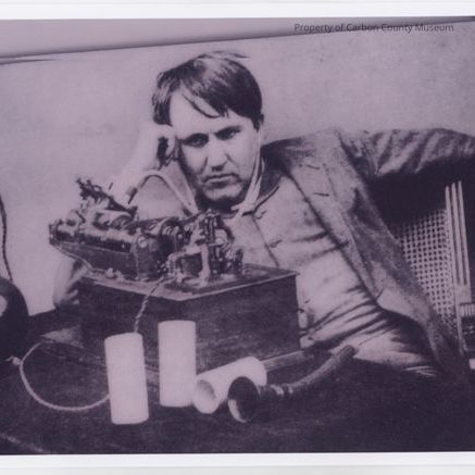 Two black & white scanned prints of Thomas Edison. Snapshot. Image of a young man lounging in a chair behind a table/desk with a cylinder player/dictaphone & other apparatus on top. Man's left arm is draped over the back of the chair; he is leaning on his right hand - elbow propped on the tabletop. His longer dark hair is mussed.