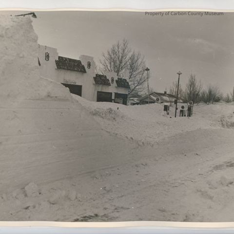 Update 2008: Black and white print, 8 x 10 of a Sinclair, Wy service station partially covered by a massive snowdrift and as a result of plowing, from the blizzard of 1949. Deep snow on left side of photo reaches to top of overhanging streetlight. The lubrication bay is partially exposed at right top half of door. The tiled roof and small chambers on either side of roof over lubrication sign are free of snow. Two garage doors and their individual overhanging tile roofs are clear of snow except for the lower 1/4 of door. Three gas pumps and light pole are partially covered with snow on the lower portion of their bases. Another pump in the background with circular sign HC on top is buried in snow up to the flat area of pump that sign is attached to. A house and dormant trees are in the right side of photo. A plowed roadway shows in foreground.