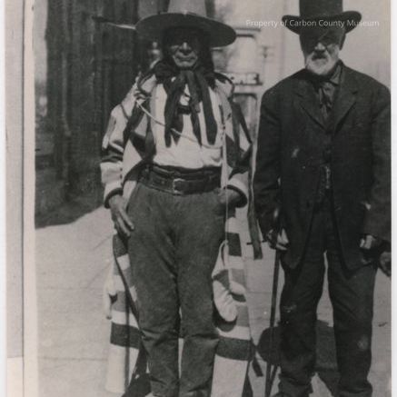 Black & white copy print. Snapshot. Image of two men standing on a sidewalk. Buildings in background. Man on left appears to be a Native American & is dressed in moccasins, a blanket coat, large hat & mittens hanging from string around chest. Man on right dressed in dark suit, shirt, & hat & is holding a cane.