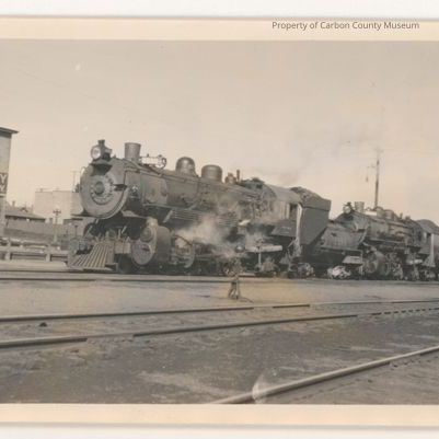 Update 3/2010: Black and white print. Snapshot. Image of a steam locomotive with two engines pulling a line of box cars stopped in a rail yard. Steam escaping from first engine. First engine is numbered 2244. Buildings in background at left, including Troy Electric Laundry.