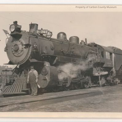 Update 3/2010: Black and white print. Snapshot. Image of a steam locomotive with two engines stopped in a rail yard . Workman with a long spouted oil can is standing on right side of cowcatcher of first engine. Engine number 2244. Number 2-261 on placard near top front of engine. Buildings in background left. Steam escaping from center bottom of first engine.