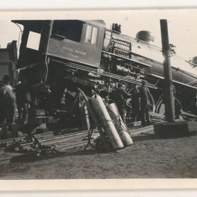 Update 3/2010: Black and white print. Snapshot. Image of the aftermath of a train wreck showing a steam engine nose down and rear up in a rail yard. Engine number appears to be 2888. See also 1956.253.0013. Hand truck with two cylinders of welding gas parked by track at center front. Workmen gathered around back of engine. Painted on the side of the cab: "Union Pacific." Buildings in background.