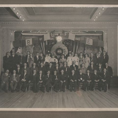 Black & white print. Snapshot. Mounted on grey matboard. Image of a large group (3 rows) of men & women posed in front of and on a stage. Wood floor in foreground. Painted backdrops behind flag-draped model of a train engine with "87" on front &"2-87" on either side. Banner draped on either side from ceiling: "B of L" "F and E" Ornate wall & ceiling decorations. "Brotherhood of Locomotive Firemen and Engineers."