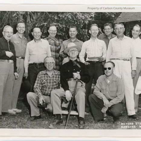 Update 2009: Black and white print of group of twelve smiling men. Standing left to right in back row are nine men dressed in western cut or casual shirts and slacks. Far left man and fourth, seventh and eighth are wearing glasses . Man fourth from right is holding a tray. Man on far right is holding his hat in his lowered left hand. Three men in front row first on left: man is kneeling, second is seated, third is kneeling . Middle seated man is holding a cup in his left hand and wears a light colored hat. He has on glasses. his tie is pulled over to his left shoulder. Men on either side are wearing glasses. Man on left holds a cigarette in his right hand. He has on a dark shirt with white square trim. Men are posed in front of a large pine tree. The pine limbs are right behind their heads. To the photo right is a log structure. There is grass in the foreground.