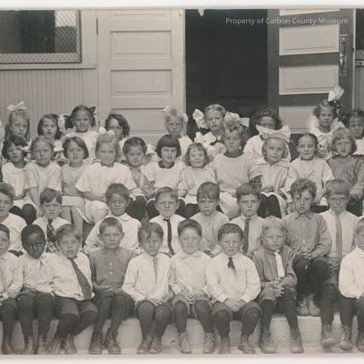 Update - January 2010: An unused black & white postcard print. Image depicts an early day school class picture of young boys & girls seated in four horizontal rows on the wooden school house steps. A woman is standing side left & a woman is seated at side right of last row. Double doors are at background with door on right ajar. Most young boys are wearing long dark knee jackets, knee length pants, shirts & ties.