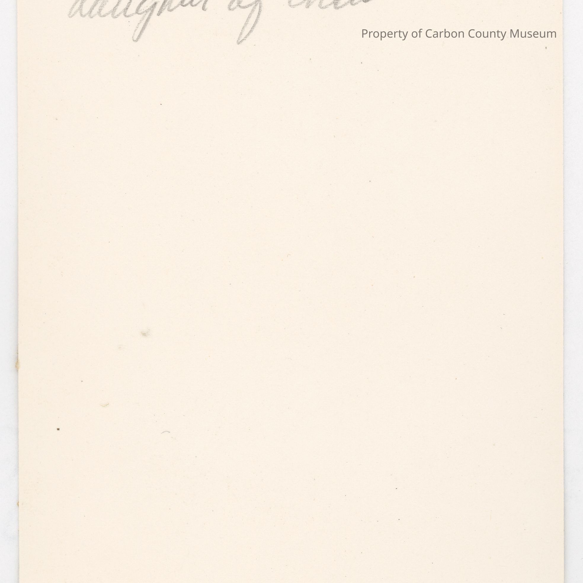 3. Studio print of a girl wearing glasses, dress with white collar and necklace. She has wavy hair. Good condition. 3 1/8" x 4 3/8." Written on back: "Laura Jensen-daughter of Chris, Meyers, Rawlins."